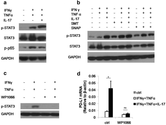 本环节的实验目的是解析NO调控PD-L1表达的下游信号通路。实验方法为采用蛋白质免疫印迹(Western blotting)技术检测MSCs中信号转导与转录激活因子3(STAT3)和核因子κB(NF-κB)p65的磷酸化水平,使用STAT3特异性抑制剂WP1066处理MSCs,检测PD-L1的mRNA表达水平。实验结果显示,IL-17联合IFNγ、TNFα处理可显著增强STAT3的磷酸化水平,但对NF-κB p65的磷酸化无进一步促进作用;NO供体SNAP同样可增强STAT3的磷酸化,而WP1066抑制STAT3磷酸化后,PD-L1的mRNA水平显著降低(n=3,P<0.05),表明STAT3是NO介导PD-L1表达的关键下游信号分子。此外,研究还发现SMT可诱导STAT3磷酸化但无法促进PD-L1表达,提示STAT3磷酸化是PD-L1表达的必要非充分条件,NO可能还通过其他通路协同调控PD-L1的表达。