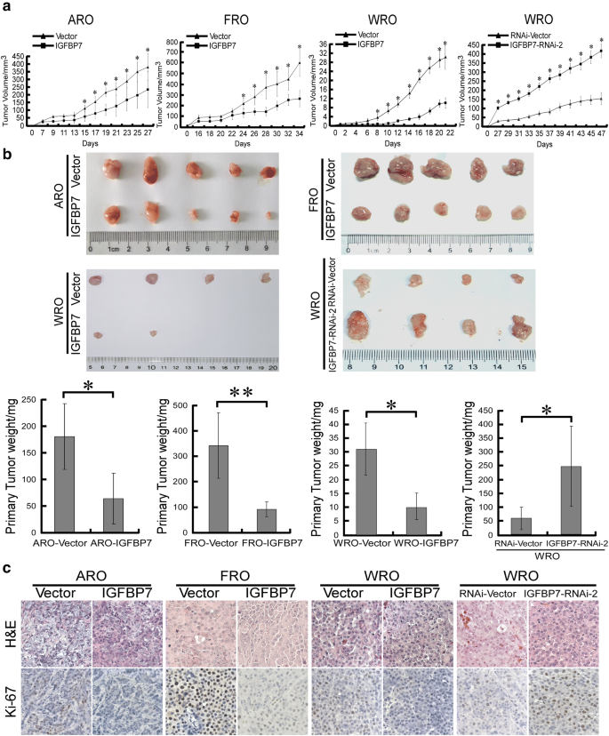 实验目的是在体内水平验证IGFBP7对甲状腺癌肿瘤生长的调控作用。研究将过表达/沉默IGFBP7的ARO、FRO、WRO细胞分别皮下接种于BALB/C裸鼠背部,每2天测量肿瘤体积,实验终点处死小鼠并取瘤称重,同时进行HE染色和Ki67免疫组化检测增殖活性。结果显示,过表达IGFBP7的ARO、FRO、WRO细胞形成的肿瘤生长速度显著慢于对照组,终点肿瘤体积和重量均显著降低(n=5,P<0.05);其中WRO过表达组5只裸鼠中仅2只形成可检测的肿瘤,而对照组5只均成瘤;沉默IGFBP7的WRO细胞形成的肿瘤生长速度显著加快,体积和重量高于对照组(n=5,P<0.05);Ki67免疫组化结果显示,过表达IGFBP7的肿瘤组织中Ki67阳性细胞比例显著降低,沉默组则显著升高,进一步证实IGFBP7在体内抑制甲状腺癌增殖。