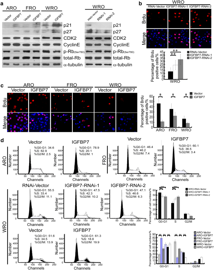 实验目的是揭示IGFBP7抑制甲状腺癌细胞增殖的细胞周期机制。研究采用Western blot检测细胞周期调控蛋白的表达,结果显示过表达IGFBP7显著上调细胞周期依赖性激酶抑制剂p21和p27的表达,同时降低视网膜母细胞瘤蛋白(Rb)的磷酸化水平,而CDK2和Cyclin E的表达无显著变化;沉默IGFBP7则得到相反结果。为进一步验证细胞周期阻滞效应,采用5-溴-2-脱氧尿苷(BrdU)掺入实验和流式细胞术分析细胞周期分布:血清饥饿同步化后,过表达IGFBP7的ARO、FRO、WRO细胞中BrdU阳性率分别为10.6%、21.2%、7.7%,显著低于对照组的44.4%、34.0%、16.0%(n=3,P<0.01);流式细胞术结果显示,过表达IGFBP7的细胞中G0/G1期比例显著增加,S期比例显著降低,沉默IGFBP7则促进细胞从G1期进入S期,证实IGFBP7通过诱导G1/S期阻滞抑制细胞增殖。