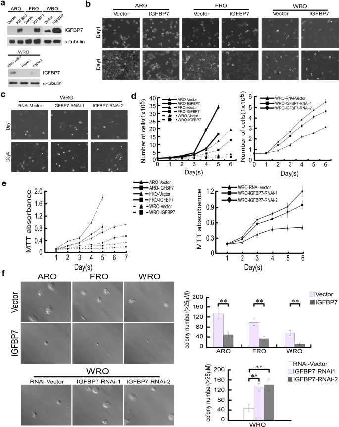 实验目的是在细胞水平验证IGFBP7对甲状腺癌细胞增殖的调控作用。研究选择无内源性IGFBP7表达的ATC细胞系ARO、FRO,通过逆转录病毒转导过表达IGFBP7;选择中等表达IGFBP7的FTC细胞系WRO,同时进行过表达和shRNA沉默(两种特异性shRNA)处理,采用蛋白质免疫印迹(Western blot)验证表达效率。随后通过细胞计数、MTT、软琼脂克隆形成、平板克隆形成实验检测增殖能力:过表达IGFBP7的ARO、FRO、WRO细胞在接种3-5天后汇合度仅约20%,而对照组细胞汇合度达80-90%;沉默IGFBP7的WRO细胞数较对照组增加2倍以上(n=3,P<0.01);软琼脂实验中,过表达IGFBP7的细胞形成的克隆数量更少、体积更小,而沉默组克隆数量更多、体积更大;MTT和细胞计数实验结果一致,证实过表达IGFBP7显著抑制甲状腺癌细胞增殖,沉默则促进增殖(n=3,P<0.05或P<0.01)。