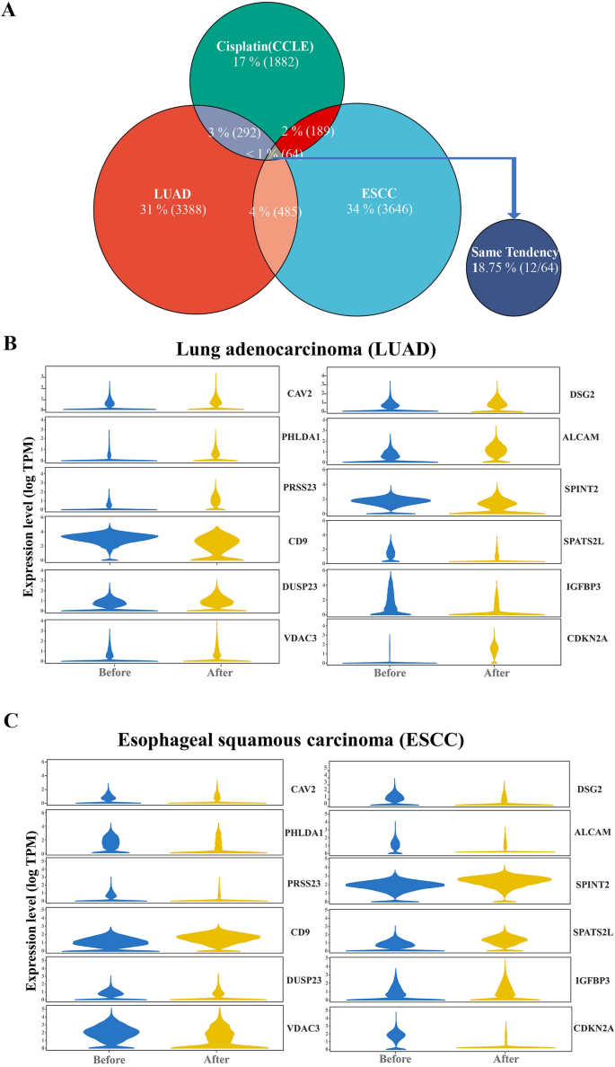 方法细节:将前期筛选的485个差异基因与作者团队前期研究中获得的铂类耐药细胞系差异基因集进行交叉分析,通过韦恩图筛选表达趋势一致的基因,最终保留在LUAD、ESCC残留肿瘤细胞及铂类耐药细胞系中均高表达的基因。