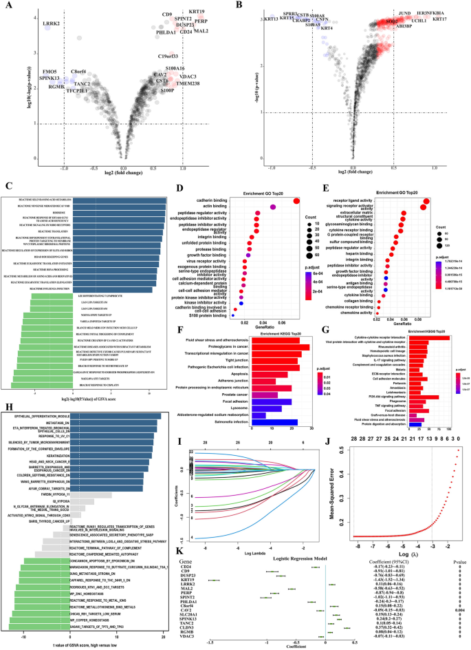 方法细节:将LUAD和ESCC的肿瘤细胞按NCS均值分为高低两组,进行差异基因分析(筛选标准为P<0.001,|logFC|>0.5);通过GO、KEGG、基因集变异分析(GSVA)对差异基因进行功能富集,解析两组细胞的功能通路差异。