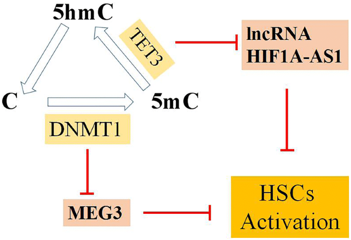 方法细节:整合已发表的表观遗传修饰研究,分析DNA甲基转移酶(DNMT)、Ten-eleven易位甲基胞嘧啶双加氧酶(TET)与lncRNA的相互作用对HSC活化的影响。