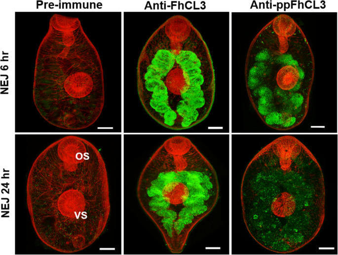 实验目的:明确FhCL3酶原在NEJs中的合成与分泌部位。方法细节:制备抗FhCL3酶原和抗ppFhCL3的多克隆抗体,对6h和24h的NEJs进行免疫荧光染色,采用共聚焦激光扫描显微镜观察定位。结果解读:免疫荧光结果显示,FhCL3酶原和前肽均定位于NEJs的肠道胃皮细胞中,抗FhCL3酶原抗体的荧光信号强于抗ppFhCL3抗体,且24h NEJs中的前肽信号进一步减弱,提示酶原在肠道内激活并释放成熟酶(n=3,P<0.05)。产品关联:文献未提及具体实验产品,领域常规使用多克隆抗体、免疫荧光染色试剂盒、共聚焦显微镜等试剂/仪器。