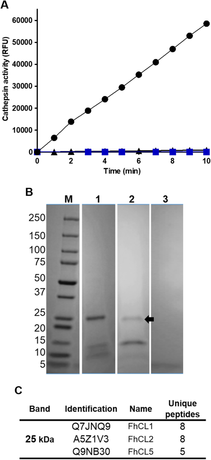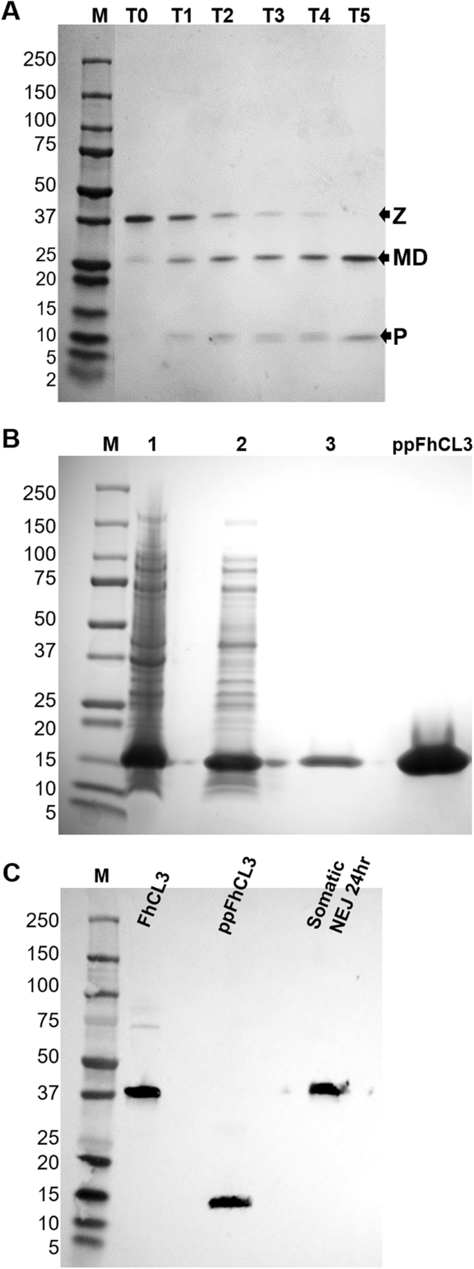实验目的:获得具有自激活活性的FhCL3酶原和具有抑制活性的重组前肽(ppFhCL3),为后续实验提供基础工具。方法细节:采用毕赤酵母表达系统重组表达FhCL3酶原,通过亲和层析纯化后,在pH4.5的醋酸钠缓冲液中37℃孵育5h,观察自激活过程;采用大肠杆菌BL21表达系统重组表达ppFhCL3,通过亲和层析纯化并验证纯度。结果解读:SDS-PAGE结果显示,FhCL3酶原(37kDa)在孵育过程中逐步切割为25kDa的成熟酶和12kDa的前肽;重组ppFhCL3为可溶性蛋白,分子量约12kDa,Western blot验证其可与抗ppFhCL3多克隆抗体结合,且能识别NEJs体细胞提取物中的天然FhCL3酶原(n=3,P<0.01)。产品关联:文献未提及具体实验产品,领域常规使用毕赤酵母表达系统、大肠杆菌表达系统、亲和层析纯化柱、SDS-PAGE凝胶等试剂/仪器。