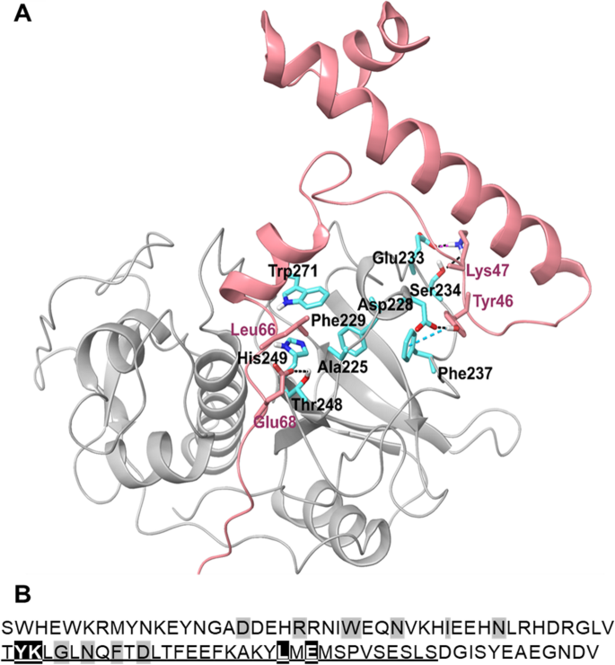 核心成果提炼:ppFhCL3通过“钳式”机制结合FhCL3成熟酶,其中Tyr46/Lys47与成熟酶的前肽结合环(PBL)互作,Leu66/Glu68嵌入活性位点,共同实现高效抑制;该机制的创新性在于首次明确了FhCL3前肽的双位点结合模式,为基于前肽的抗寄生虫药物设计提供了分子模板;统计学结果显示,关键残基突变后抑制活性显著降低(P<0.001),证实了这些残基的功能重要性。