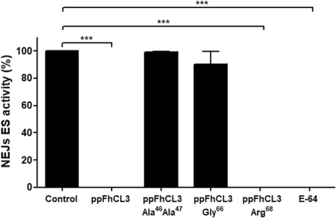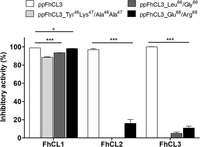 实验目的:验证ppFhCL3关键结合残基在抑制成熟酶中的作用。方法细节:构建三种ppFhCL3突变体:Tyr46Lys47→Ala46Ala47(双突变)、Leu66→Gly66、Glu68→Arg68,重组表达后检测其对组织蛋白酶及人源组织蛋白酶的抑制活性。结果解读:双突变体完全丧失对FhCL2、FhCL3的抑制活性,Ki>10000nM;Leu66→Gly66突变体对FhCL3的Ki为8nM,比野生型降低4000倍;Glu68→Arg68突变体对FhCL的抑制活性无显著变化,但对HsCL的抑制活性增强(n=3,P<0.001),证实Tyr46、Lys47、Leu66是维持抑制活性的关键残基。产品关联:文献未提及具体实验产品,领域常规使用定点突变试剂盒、重组表达系统等试剂/仪器。