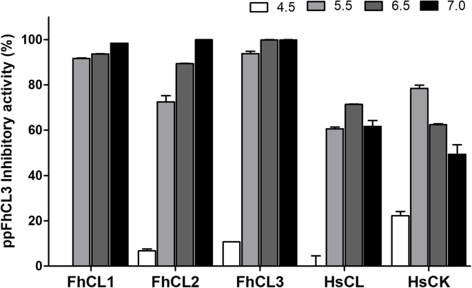 实验目的:检测ppFhCL3对不同亚型组织蛋白酶L及人源组织蛋白酶的抑制活性和pH依赖性。方法细节:在pH4.5-7.0的缓冲液中,将10nM ppFhCL3与重组FhCL1、FhCL2、FhCL3及人组织蛋白酶L(HsCL)、人组织蛋白酶K(HsCK)共孵育,检测酶活性变化;同时检测ppFhCL3对成虫排泄分泌产物(ES)中天然组织蛋白酶的抑制活性。结果解读:ppFhCL3对FhCL1、FhCL2、FhCL3的抑制活性在pH7.0时达到最高(接近100%),pH4.5时无抑制活性;对HsCL和HsCK的抑制活性显著降低,最适pH分别为6.5和5.5;ppFhCL3可完全抑制成虫ES产物中的组织蛋白酶活性,且能通过pull-down实验结合FhCL1、FhCL2、FhCL5;酶动力学检测显示,ppFhCL3对FhCL3的抑制常数(Ki)<0.002nM,对FhCL1、FhCL2的Ki分别为0.04nM、0.004nM,对HsCL、HsCK的Ki分别为26.6nM、2.0nM,显示出极强的寄生虫选择性(n=3,P<0.001)。产品关联:文献未提及具体实验产品,领域常规使用荧光底物、酶标仪、pull-down试剂盒等试剂/仪器。