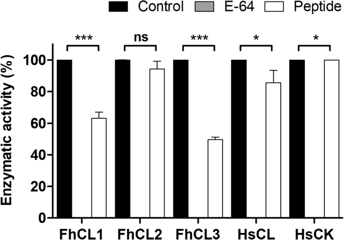 实验目的:探索基于ppFhCL3关键结合区域的短肽抑制剂的可行性。方法细节:合成包含Tyr46、Leu66等关键残基的33肽,检测其对组织蛋白酶及人源组织蛋白酶的抑制活性。结果解读:500nM的33肽仅能抑制约50%的FhCL3活性,对FhCL1的抑制率约30%,对其他酶无显著抑制作用(n=3,P>0.05),提示短肽无法模拟完整前肽的构象,需维持前肽的整体结构才能实现高效抑制。产品关联:文献未提及具体实验产品,领域常规使用多肽合成服务、酶活性检测试剂盒等试剂/仪器。