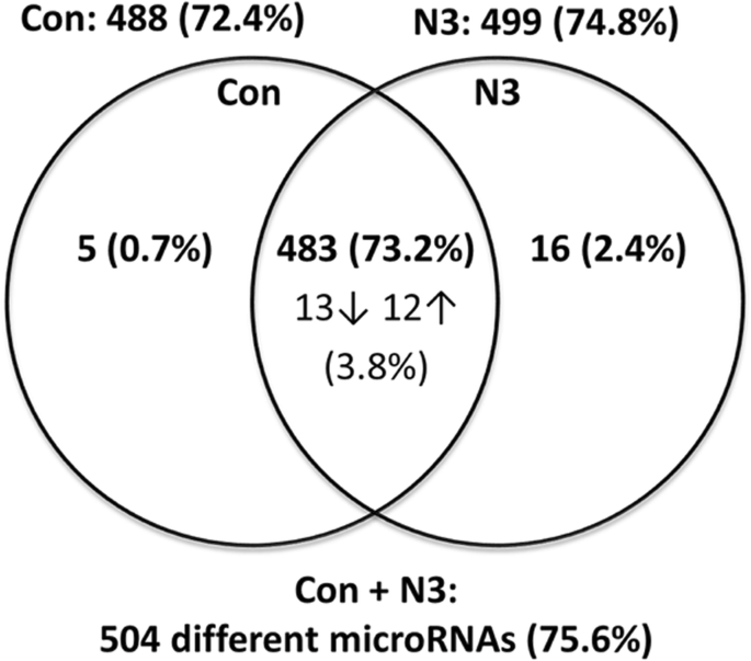 本环节的核心目标是筛选n-3长链多不饱和脂肪酸干预下女性胎盘组织中差异表达的微小核糖核酸。研究选取INFAT队列中对照组与n-3长链多不饱和脂肪酸干预组各3例女性后代的胎盘样本,提取含小RNA的总RNA并分别混合成组特异性样本池,采用384孔TaqMan低密度人类微小核糖核酸芯片对667种人类微小核糖核酸进行检测。结果显示,两组共检测到504种微小核糖核酸,其中46种呈现差异表达特征,包括25种在两组间表达水平显著差异的微小核糖核酸(12种上调、13种下调),以及21种仅在单组中检测到表达的微小核糖核酸;染色体19微小核糖核酸簇(C19MC)的43种微小核糖核酸在两组中均有表达,其中微小核糖核酸-517b与微小核糖核酸-522呈现显著的干预响应差异。