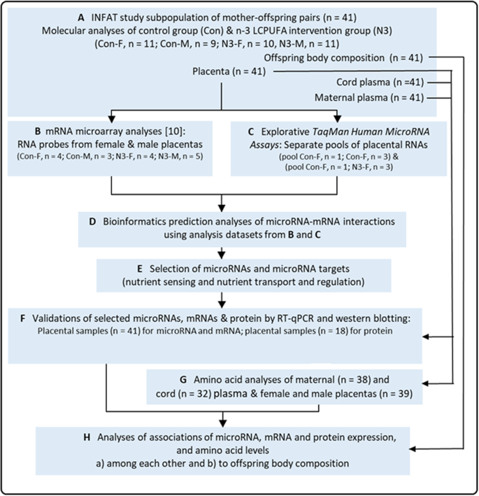 作者的综述逻辑围绕“儿童肥胖的公共卫生问题→胎儿编程的关键作用→n-3长链多不饱和脂肪酸的调控机制→胎盘的核心功能→微小核糖核酸的调控潜力→现有研究不足”展开,分类维度涵盖公共卫生、分子机制、临床研究三个层面。现有研究显示,n-3长链多不饱和脂肪酸可通过PPARγ等核受体通路调控胎盘营养转运相关基因表达,但其具体调控网络仍不清晰;胎盘微小核糖核酸具有高度组织特异性,且在胎盘发育中发挥关键作用,但微小核糖核酸与氨基酸转运体的直接调控关系尚未被证实;多数研究基于细胞或动物模型,缺乏人类孕期营养干预的临床样本数据,尤其是针对胎儿性别分层的分析,无法揭示性别特异性的调控机制。本研究的创新价值在于,首次在人类随机对照干预队列中,结合多组学技术与长期临床随访数据,系统解析了胎盘微小核糖核酸-99a(miR-99a)介导的性别特异性调控网络,明确了其与氨基酸转运及后代体成分的关联,为孕期营养干预的精准化提供了分子依据。