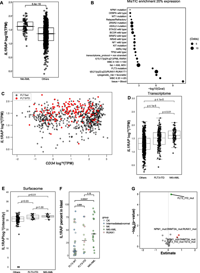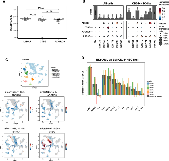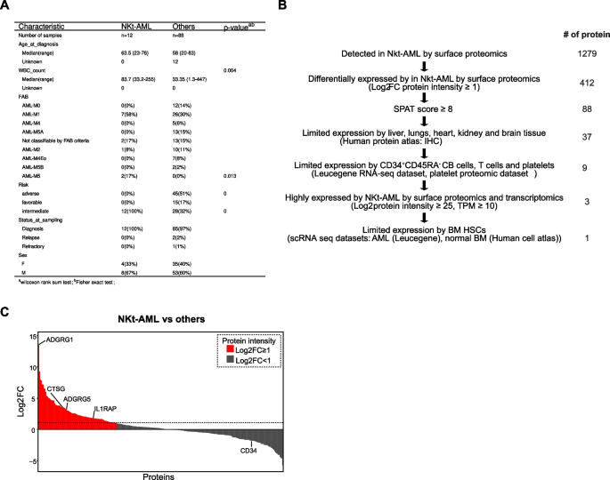 Biomarker定位:本研究发现的Biomarker为IL1RAP,属于细胞表面跨膜蛋白,筛选逻辑为通过整合表面蛋白质组、bulk转录组和单细胞转录组的多组学分析,从100例AML样本的表面蛋白质组数据中筛选出差异表达蛋白,结合正常组织和造血细胞的表达数据缩小候选范围,再通过单细胞转录组和流式细胞术验证其在NKt-AML中的特异性表达。