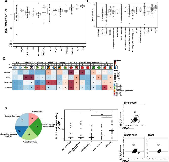 研究过程详述:IL1RAP的表达来源为原发性NKt-AML细胞的表面,验证方法包括流式细胞术检测细胞表面蛋白表达、多组学数据分析转录和蛋白水平表达,特异性表现为在NKt-AML的原始细胞(包括类造血干细胞的白血病细胞)中高表达,而在正常骨髓造血干细胞中低表达,流式细胞术显示NKt-AML中表达IL1RAP的白血病细胞比例显著高于其他AML亚型(n=19,P<0.01);敏感性方面,在NKt-AML中IL1RAP的表达具有较高的一致性,所有6例单细胞测序样本的白血病细胞均高表达IL1RAP。