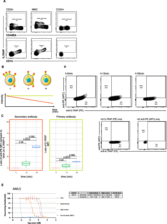 实验目的:验证IL1RAP作为抗体药物偶联物(ADC)靶点的可行性。方法细节:首先通过流式细胞术分析正常骨髓中IL1RAP的表达,评估靶点的安全性;然后在OCI-AML3细胞系中进行IL1RAP抗体的内化实验,检测抗体与IL1RAP结合后的内化效率;最后在AML5细胞系中进行ADC抑制实验,评估靶向IL1RAP的ADC对白血病细胞的杀伤作用。结果解读:正常骨髓中IL1RAP主要表达于CD34-细胞,CD34+造血干细胞中仅少量表达,提示靶向IL1RAP的治疗可能具有较低的骨髓毒性。内化实验显示,IL1RAP抗体与细胞结合后30分钟,二级抗体信号降低50%,表明IL1RAP可随抗体内化进入细胞,符合ADC靶点的要求。ADC抑制实验显示,Nadunolimab(抗IL1RAP抗体)联合PNU偶联的二级抗体对AML5细胞的IC50为0.041 nM,而单独PNU偶联二级抗体的IC50为4.22 nM,IL1RAP阴性的U266细胞对该ADC无响应,提示靶向IL1RAP的ADC可特异性杀伤IL1RAP阳性的白血病细胞。