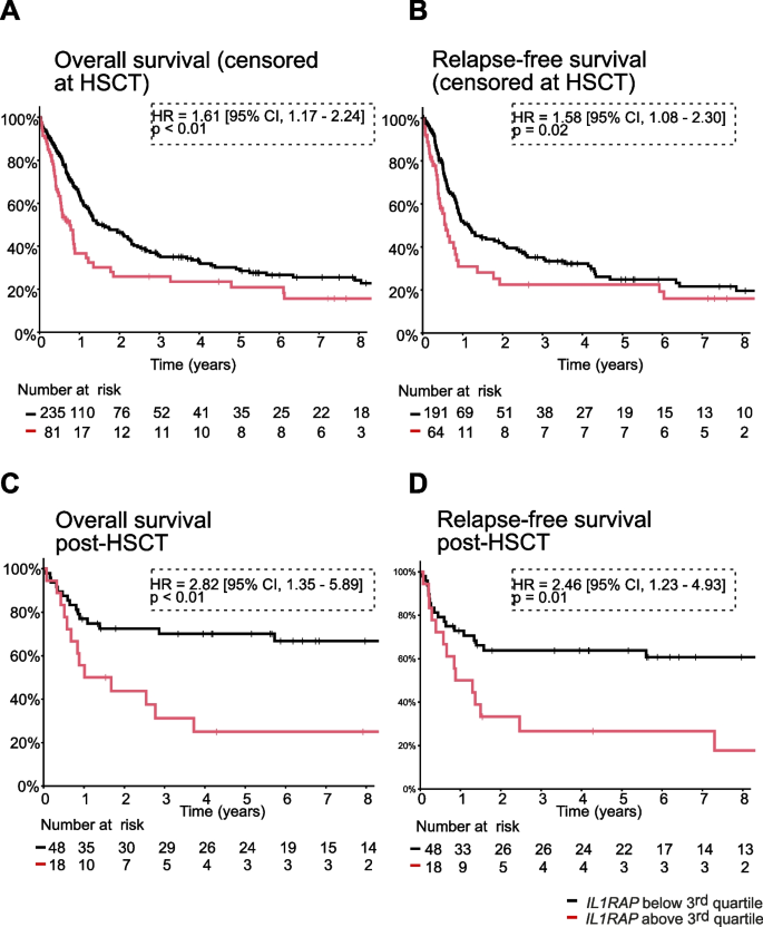 实验目的:分析IL1RAP表达与AML患者临床预后的关联。方法细节:利用Leucegene队列中691例AML患者的转录组数据和临床信息,将中危AML患者(n=316)根据IL1RAP表达水平分为高表达组(第3四分位数以上)和低表达组,分析两组的总生存率(OS)和无复发生存率(RFS),以及接受HSCT患者的预后差异。结果解读:高IL1RAP表达的中危AML患者总生存率显著低于低表达组(HR=1.61,95% CI 1.17-2.24,P<0.01),无复发生存率也显著降低(HR=1.58,95% CI 1.08-2.30,P=0.02)。对于接受HSCT的患者(n=66),高IL1RAP表达组的总生存率(HR=2.82,95% CI 1.35-5.89,P<0.01)和无复发生存率(HR=2.46,95% CI 1.23-4.93,P=0.01)均显著低于低表达组,提示IL1RAP高表达可预测HSCT无响应。