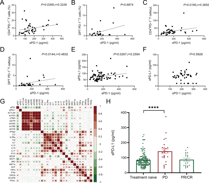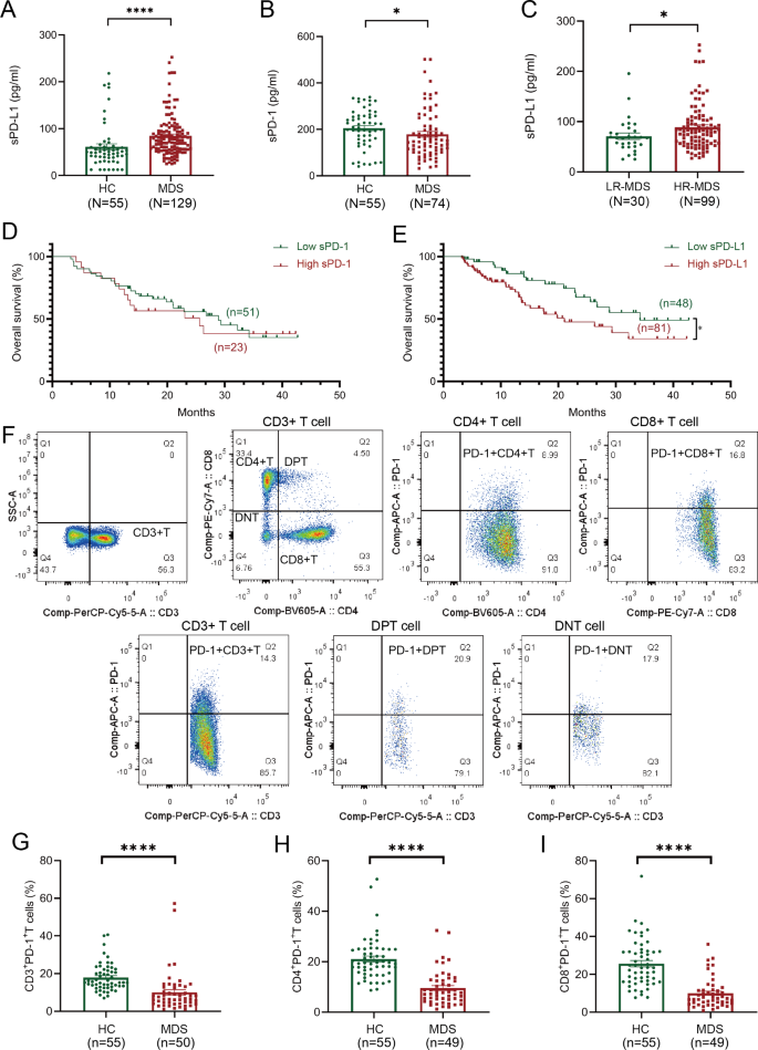 实验目的是检测MDS患者血浆中可溶性免疫检查点的表达水平及外周血T细胞亚群的PD-1表达比例,明确sPD-L1的表达特征与免疫细胞的关联。方法细节采用酶联免疫吸附试验(ELISA)定量检测血浆中sPD-1、sPD-L1及其他可溶性免疫检查点(包括sCTLA-4、sGITR、sLAG-3等)的水平,采用流式细胞术分析外周血CD3+、CD4+、CD8+等T细胞亚群中PD-1+细胞的比例,并对比健康对照与不同风险分层MDS患者的差异。结果解读:初发MDS患者的血浆sPD-L1水平显著高于健康对照(中位数75.26 pg/ml,n=129,P<0.0001),而sPD-1及其他可溶性免疫检查点的水平则低于健康对照;高危组MDS患者的sPD-L1水平显著高于低危组(n=129,P<0.05);同时,MDS患者外周血中PD-1+ T细胞亚群的比例显著低于健康对照(n=129,P<0.05),提示sPD-L1的升高与MDS患者的免疫抑制状态相关。