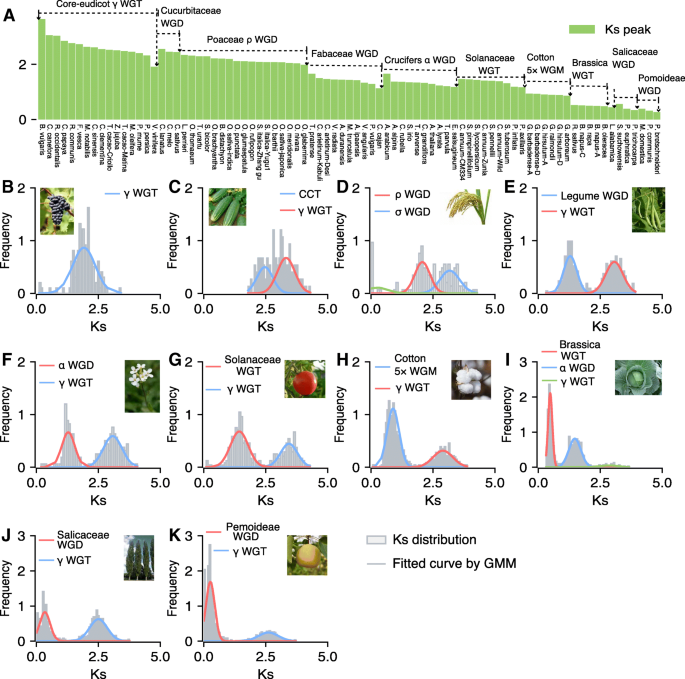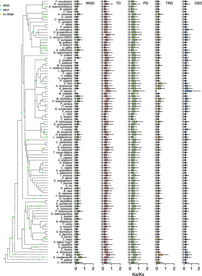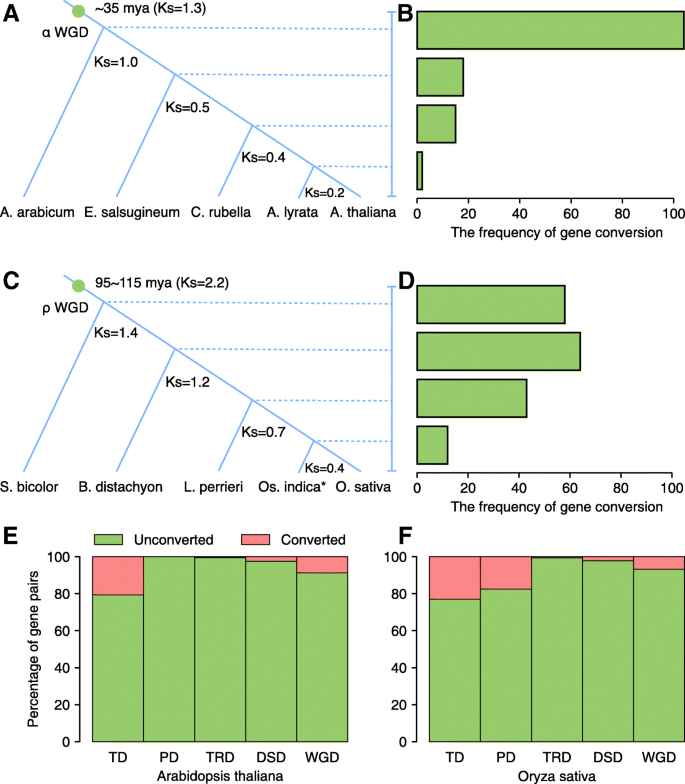 结果解读:全基因组复制(WGD)衍生的基因对的基因转换率在多倍体化后迅速升高,随后随时间逐渐下降,如拟南芥α WGD后与Aethionema arabicum分化时(Ks=1.0)的基因转换事件数为104,与Arabidopsis lyrata分化时(Ks=0.2)仅为2;TD和PD基因的基因转换率显著高于其他模式(拟南芥TD为20.6%,水稻TD为23.0%),而TRD基因的基因转换率极低,表明其序列分化程度高。