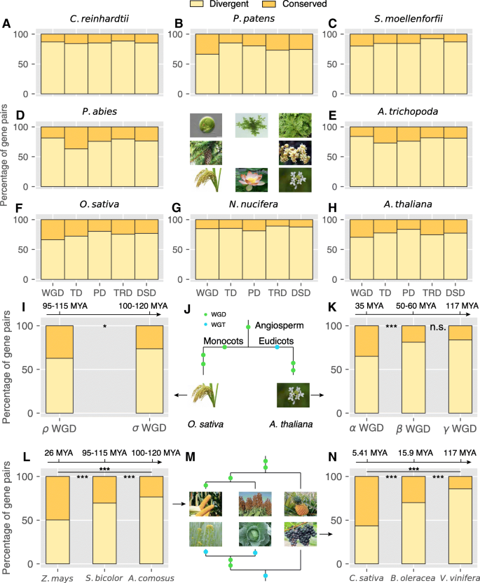 结果解读:所有复制模式的基因对均存在广泛的表达分化,且表达分化比例随复制事件年龄增加而显著升高,如拟南芥中α WGD(~35 Mya)的基因对表达分化比例为65%,γ WGT(~117 Mya)的基因对表达分化比例为84%(P<0.001);TD和PD基因的表达分化比例显著低于TRD和DSD基因,表明其功能分化速度较慢,可能通过序列同质化(基因转换)维持功能协同。