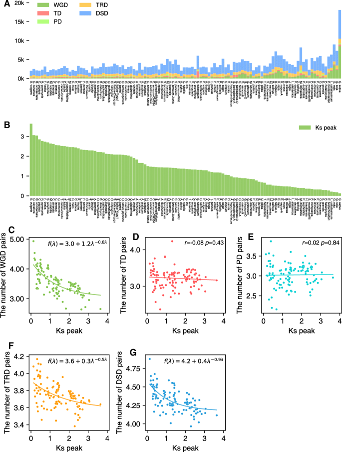 结果解读:全基因组复制(WGD)、转座复制(TRD)、分散复制(DSD)衍生的基因数量随复制年龄增加呈指数下降趋势(WGD:r=-0.70, P<0.001;TRD:r=-0.49, P<0.001;DSD:r=-0.61, P<0.001),而串联复制(TD)和近端复制(PD)的基因数量随时间无显著减少(TD:r=-0.08, P=0.43;PD:r=0.02, P=0.84),表明TD和PD能持续为植物提供适应环境的变异来源。
