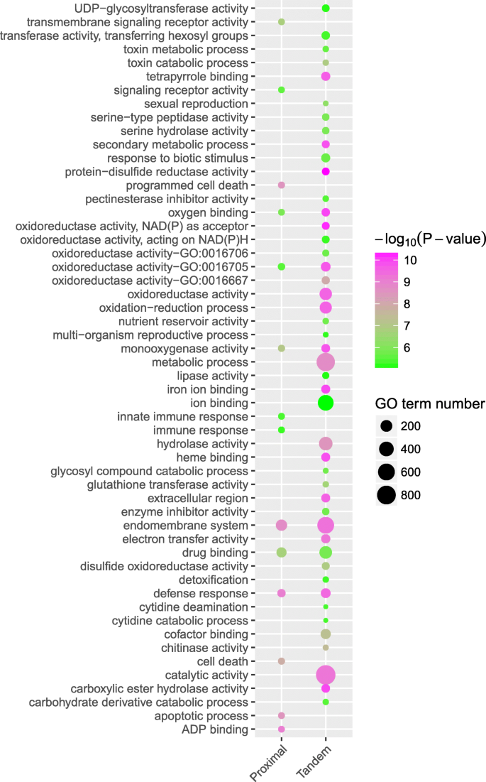 结果解读:TD和PD基因的Ka/Ks比值显著高于其他复制模式,表明其经历了更强的正选择压力;功能富集分析显示,拟南芥中TD基因显著富集于铁离子结合、血红素结合、转移酶活性等功能,PD基因显著富集于细胞死亡、免疫应答、信号受体活性等功能,这些功能均与植物的自我防御和环境适应密切相关。