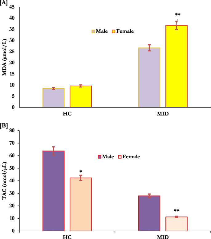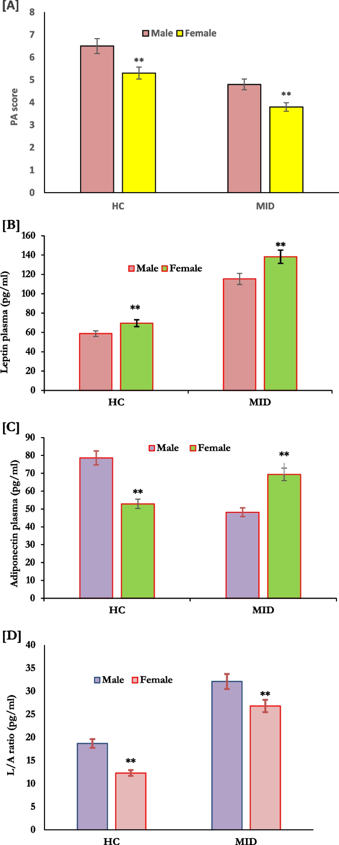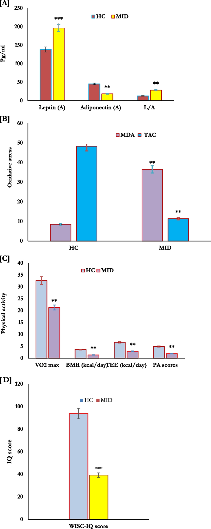结果解读显示:矿物质元素水平变化与IQ评分、氧化应激指标(MDA、TAC)呈正相关,与肥胖标志物(BMI、WHR、WHtR)呈负相关;瘦素、L/A比值与BMI、WHtR、运动评分、TAC呈负相关,与MDA、矿物质元素呈正相关;女性MID受试者的运动评分更低,瘦素、L/A比值更高,脂联素水平更低,MDA水平更高,TAC水平更低(n=120,P=0.001),提示性别可能影响MID的代谢与氧化应激状态。