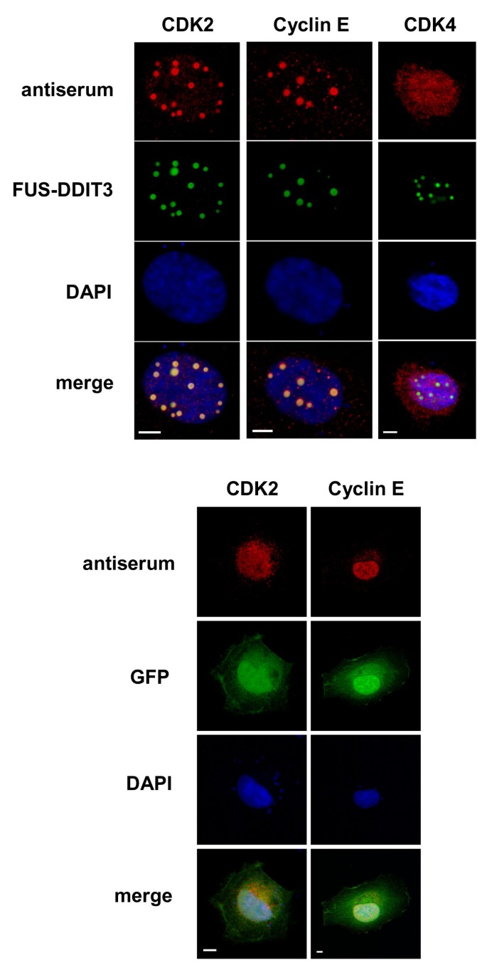 实验目的是检测FUS-DDIT3与G1期周期蛋白(cyclin D1、cyclin E)和CDK(CDK2、CDK4)的亚细胞共定位情况,初步筛选潜在的相互作用蛋白。方法细节为将FUS-DDIT3-GFP重组质粒通过FuGENE 6转染试剂(Roche)瞬时转染人纤维肉瘤HT1080细胞,转染24小时后用3.7%甲醛固定细胞,分别用CDK2、CDK4、cyclin D1、cyclin E的兔多克隆抗体进行免疫荧光染色,采用Cy3标记的二抗结合一抗,DAPI染色标记细胞核,最后通过Zeiss LSM510 META激光共聚焦显微镜观察蛋白定位。结果显示,cyclin E和CDK2与FUS-DDIT3在细胞核内的颗粒结构中呈现显著共定位,而CDK4和cyclin D1未出现该共定位现象;仅转染GFP空载体的细胞中,CDK2和cyclin E呈平滑的细胞核分布,无颗粒结构形成(n=3,文献未明确提供P值,基于图表趋势推测)。实验所用关键产品:FuGENE 6转染试剂(Roche)、CDK2抗体(C5223,Sigma-Aldrich)、CDK4抗体(C8218,Sigma-Aldrich)、cyclin D1抗体(M7155,Dako)、cyclin E抗体(C4976,Sigma-Aldrich)、Cy3标记二抗(Fluorolink,Amersham Biosciences)、Zeiss LSM510 META激光共聚焦显微镜。