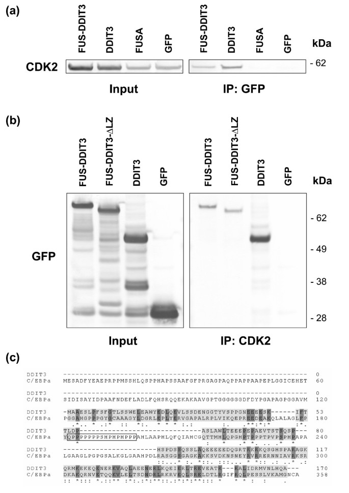 实验目的是证实FUS-DDIT3和DDIT3与CDK2的直接相互作用,并确定具体的结合结构域。方法细节分为两个部分:首先在稳定表达FUS-DDIT3-GFP的HT1080细胞中进行预实验,通过GFP抗体免疫共沉淀(Co-IP)后,蛋白质免疫印迹(Western Blot)检测到内源性CDK2的存在;随后为进一步验证相互作用,将CDK2-DsRed1重组质粒分别与FUS-DDIT3-GFP、DDIT3-GFP、FUS N端结构域-GFP或GFP空载体共转染HT1080细胞,免疫共沉淀后通过蛋白质免疫印迹检测CDK2的存在;同时构建缺失亮氨酸拉链结构域的FUS-DDIT3ΔLZ-GFP突变体,通过CDK2抗体免疫共沉淀验证结合区域。结果显示,CDK2-DsRed1存在于FUS-DDIT3和DDIT3的免疫沉淀复合物中,而FUS N端结构域和GFP对照组中未检测到;缺失亮氨酸拉链结构域的FUS-DDIT3ΔLZ仍能与CDK2结合,说明结合区域位于DDIT3的亮氨酸拉链结构域N端,且不依赖亮氨酸拉链结构介导(n=3,文献未明确提供P值,基于图表趋势推测)。实验所用关键产品:GFP抗体(8372-2,BD Pharmingen)、CDK2抗体(C5223,Sigma-Aldrich)、NuPAGE 4-12% Bis-Tris凝胶(Invitrogen)、PVDF膜(Millipore)。