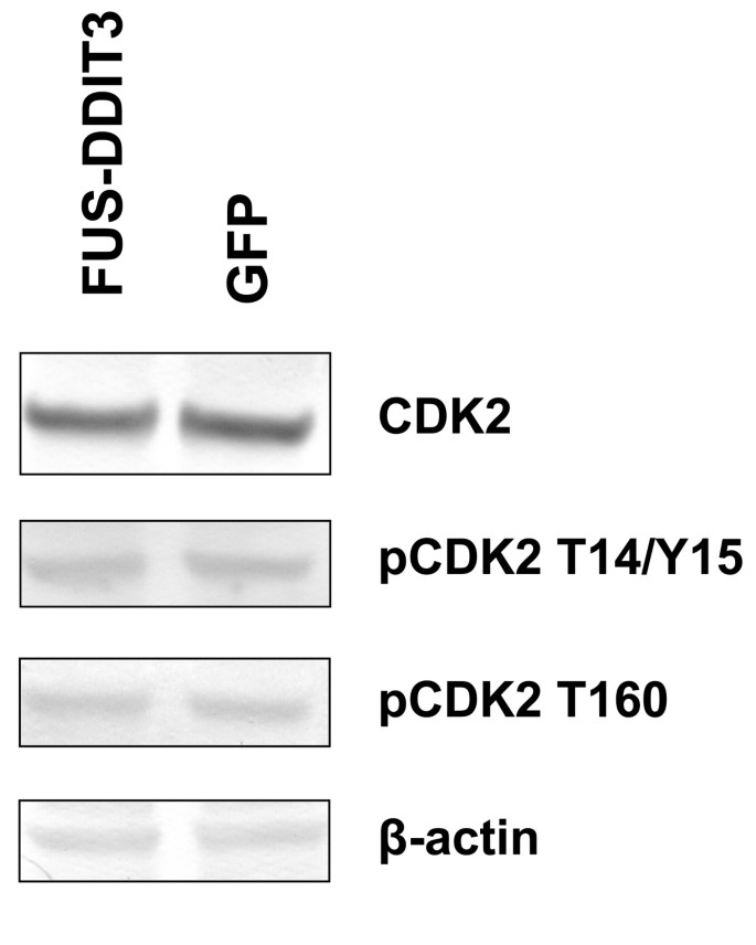 实验目的是分析FUS-DDIT3表达对CDK2的表达水平、磷酸化状态及蛋白半衰期的影响,明确该相互作用对CDK2基础功能的调控。方法细节为将FUS-DDIT3-GFP或GFP空载体转染HT1080细胞,转染42小时后收集细胞蛋白,通过蛋白质免疫印迹检测CDK2总蛋白水平、Thr14/Tyr15位点的抑制性磷酸化水平、Thr160位点的激活态磷酸化水平;同时采用环己酰亚胺追踪实验检测CDK2的蛋白半衰期。结果显示,FUS-DDIT3表达组与对照组的CDK2总蛋白量、磷酸化水平均无显著差异,蛋白半衰期也未出现改变(n=3,P>0.05,文献未明确提供具体数值,基于图表趋势推测)。实验所用关键产品:CDK2抗体(sc-6248,Santa Cruz Biotechnology)、磷酸化CDK2 Thr14/Tyr15抗体(Santa Cruz Biotechnology)、磷酸化CDK2 Thr160抗体(Cell Signaling)、β-actin抗体(mAbcam8226,Abcam)。