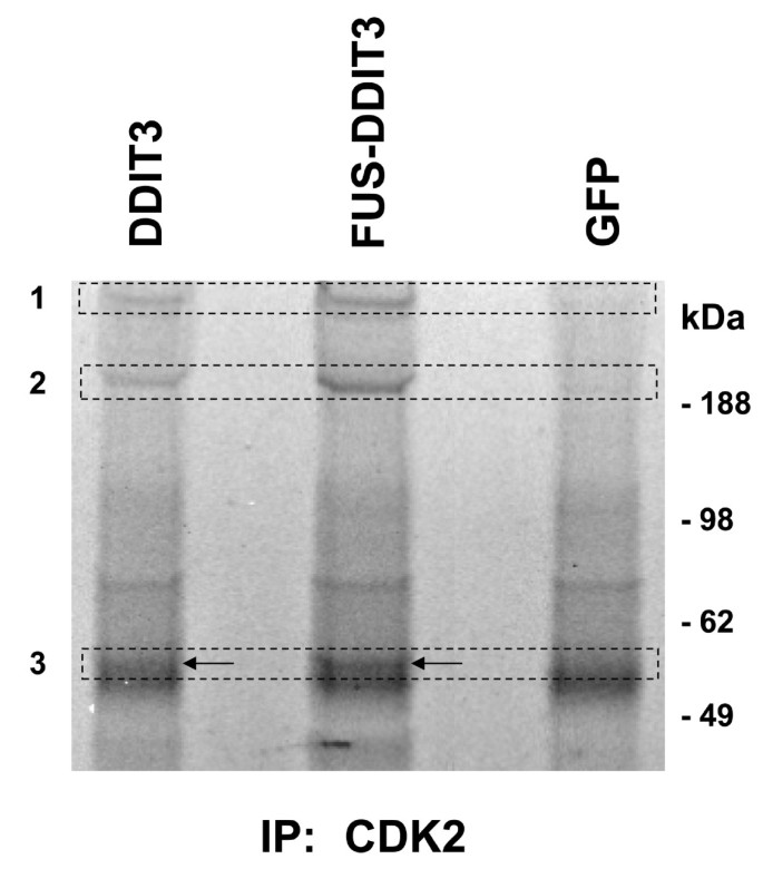 实验目的是解析FUS-DDIT3或DDIT3表达对CDK2结合蛋白组的影响,探索该相互作用的下游功能效应。方法细节为将FUS-DDIT3-GFP、DDIT3-GFP或GFP空载体转染HT1080细胞,通过CDK2抗体进行免疫共沉淀,将沉淀的蛋白通过SDS-PAGE分离后,采用SYPRO Ruby凝胶染色剂染色,对差异条带进行液相色谱-串联质谱(LC-MS/MS)分析。结果显示,与对照组相比,FUS-DDIT3和DDIT3表达组中,CDK2与细胞骨架蛋白plectin、肌球蛋白(myosin)、波形蛋白(vimentin)的结合亲和力显著增强,这些蛋白在对照组的免疫沉淀复合物中未被检测到(n=3,文献未明确提供P值,基于图表趋势推测)。实验所用关键产品:SYPRO Ruby凝胶染色剂(Sigma-Aldrich)、LC-MS/MS检测(哥德堡大学蛋白质组学核心设施)。