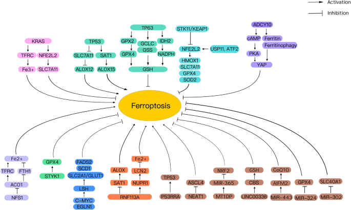 实验目的:解析肺癌中特异性信号通路对铁死亡的调控作用及交叉对话;方法细节:整合肺癌细胞系(如A549、H1299、Calu-1)、动物异种移植模型及临床样本的研究数据,分析KRAS、TP53、NFE2L2、YAP等关键通路对铁死亡的调控;结果解读:KRAS突变通过增加铁积累和SLC7A11表达调控铁死亡敏感性;TP53通过转录抑制SLC7A11或激活ALOX家族促进铁死亡;NFE2L2通过上调抗氧化基因抑制铁死亡;YAP通路通过调控铁代谢影响铁死亡敏感性,各通路之间存在交叉调控,共同决定肺癌细胞的铁死亡敏感性。