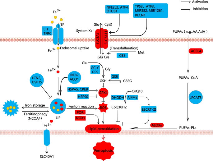 实验目的:明确铁死亡的核心分子特征及多层面调控网络;方法细节:通过整合已有的细胞生物学、分子生物学研究数据,从脂质过氧化、铁代谢、抗氧化通路三个核心层面解析铁死亡的调控机制;结果解读:铁死亡的核心驱动因素是铁依赖的脂质过氧化,GSH依赖的抗氧化通路(SLC7A11-GPX4轴)是抑制铁死亡的关键通路,非依赖通路包括CoQ10、BH4介导的抗氧化机制,铁代谢通路通过调控细胞内铁的摄取、储存和排出影响铁死亡敏感性,各通路之间相互作用共同决定细胞的铁死亡敏感性。