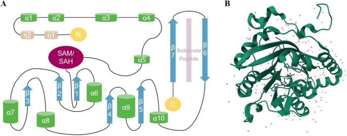 实验目的是明确METTL蛋白家族的分子结构组成与各功能域的调控机制;方法细节为整合已有的结构生物学研究数据,分析METTL蛋白的保守结构域及其功能;结果解读显示,METTL蛋白家族属于七链β折叠甲基转移酶亚家族,包含N端RNA结合结构域、甲基转移酶结构域(MTD)、C端VCR保守结构域和S-腺苷甲硫氨酸(SAM)结合结构域。其中MTD中的有序多肽环可作为细胞内SAM分子的平衡传感器,通过构象变化调控甲基化效率;NPPF基序作为MTD的活性位点,促进底物RNA与SAM结合并诱导甲基化;无序环通过电荷状态调控METTL蛋白与RNA的结合能力。VCR结构域的功能尚未完全阐明,有研究显示其可能参与RNA剪接和靶RNA甲基化调控。