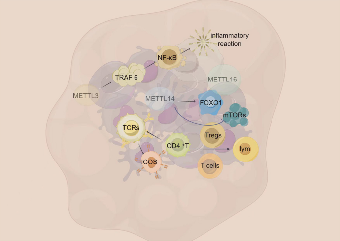 实验目的是阐明METTL家族在肿瘤免疫微环境中的调控作用;方法细节为整合免疫细胞功能实验、免疫组库分析、临床免疫治疗响应数据等研究结果;结果解读显示,METTL家族成员通过调控免疫检查点表达、免疫细胞浸润、炎症因子分泌等多个环节影响肿瘤免疫逃逸,例如METTL3通过m6A修饰调控PD-L1 mRNA的稳定性,促进膀胱肿瘤细胞的免疫逃逸;METTL14可维持诱导性调节T细胞(iTregs)的稳定性和功能,影响肿瘤免疫微环境的抑制状态。部分METTL成员还可作为免疫治疗响应的预测标志物,例如METTL1在头颈部鳞状细胞癌中与免疫检查点抑制剂(ICB)治疗响应相关。