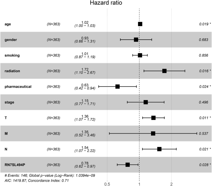 实验目的是验证RN7SL494P是否为肺腺癌患者预后的独立影响因素,排除其他临床因素的干扰。方法细节为将患者年龄、性别、放疗史、化疗史、病理分级、T分期、N分期及RN7SL494P表达水平纳入单因素及多因素Cox回归分析,评估各因素对患者生存的影响。结果解读显示,单因素Cox分析显示RN7SL494P高表达可显著降低患者死亡风险(风险比HR=0.78,P=0.020);多因素Cox分析显示RN7SL494P仍为独立预后因素(HR=0.78,P=0.028),同时年龄、T分期、N分期也是独立风险因素,放疗可能降低治疗疗效,而化疗可显著延长患者生存时间(