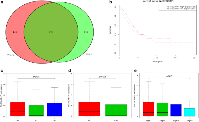 实验目的是筛选随淋巴结转移梯度及TNM分期梯度动态变化的基因,并进一步关联患者生存时间,锁定兼具转移预测与预后评估价值的核心基因。方法细节为采用Kruskal-Wallis检验分析差异基因在淋巴结转移梯度(N0、N1、N2)及TNM分期(I-IV)中的表达变化,通过Kaplan-Meier检验分析基因表达与患者生存时间的相关性。结果解读显示,112个基因与淋巴结转移或TNM分期的梯度变化相关,其中仅RN7SL494P的表达与患者生存时间显著相关(
