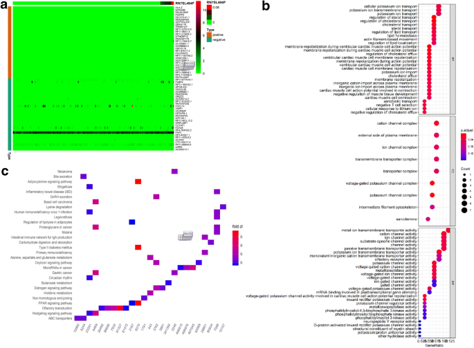 实验目的是在独立数据集上验证RN7SL494P的功能,并分析其共表达基因的生物学通路,探索其潜在调控机制。方法细节为从CCLE数据库下载肺癌细胞系的RNA-seq数据,计算RN7SL494P的共表达基因(共表达系数阈值设为0.2),对筛选出的共表达基因进行GO及KEGG功能富集分析。结果解读显示,共筛选出30个上调共表达基因和30个下调共表达基因(