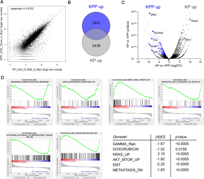方法细节:对KP(KRASG12D、Tp53突变)和KPP(KRASG12D、Tp53突变、Pten缺失)细胞进行RNA测序,通过基因集富集分析(GSEA)比较两组细胞的转录组差异;同时对两组细胞进行磷酸化蛋白质组学分析,比较基础状态及放疗后磷酸化蛋白质组的变化,重点分析DNA损伤修复通路和凋亡相关通路的差异。