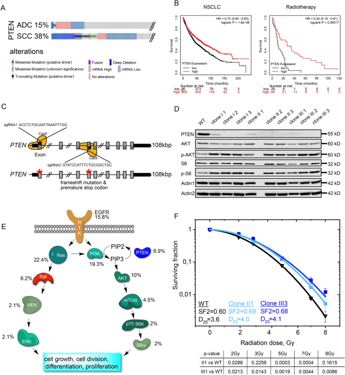 方法细节:首先通过cBioportal数据库分析NSCLC患者中PTEN的突变频率,通过KM-plotter分析PTEN表达与患者总生存期及放疗应答的关联;随后采用CRISPR/Cas9基因编辑技术,在人肺气管干细胞样细胞系BEAS-2B中同时编辑PTEN的外显子1和外显子4,构建PTEN杂合缺失和纯合缺失的细胞克隆,通过免疫印迹验证PTEN的缺失及下游AKT信号通路的激活;同时构建携带KRASG12D、Tp53突变及Pten缺失的小鼠NSCLC细胞模型(KPP),并通过免疫印迹和免疫组化验证模型的可靠性。