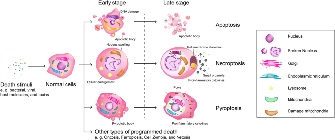 结果解读:凋亡的形态学特征为染色质浓缩、细胞膜碎片化、形成凋亡小体,无炎症反应;坏死性凋亡表现为细胞肿胀、细胞器膨大、细胞膜破裂,释放胞内内容物引发炎症;细胞焦亡则分为早期与晚期阶段,早期细胞膜形成大量焦亡小体,晚期细胞膜形成10-14nm的膜孔,释放IL-1β、IL-18等炎症因子,伴随强烈炎症反应(对应Fig1)。