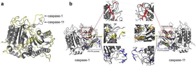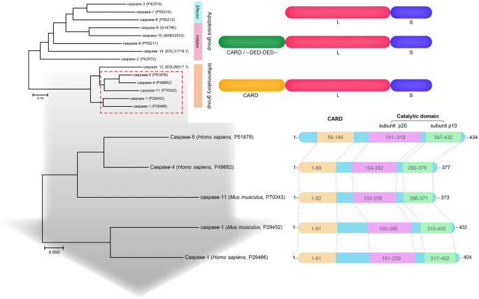 方法细节:通过引用系统发育分析与蛋白结构研究数据,对比Caspase家族成员的氨基酸序列同源性,分析Caspase-1与Caspase-11的蛋白结构域(CARD结构域、催化结构域)、催化位点、底物结合口袋的差异。