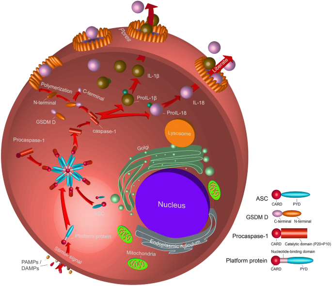 结果解读:经典通路中,病原体相关分子模式(PAMPs)或损伤相关分子模式(DAMPs)激活炎症小体受体(如NLRP3、AIM2),招募接头蛋白ASC与procaspase-1,形成炎症小体复合物,procaspase-1发生自切割激活为成熟Caspase-1,切割GSDMD的N端结构域与C端结构域,N端结构域寡聚化形成膜孔,导致细胞焦亡,同时Caspase-1切割proIL-1β与proIL-18,产生成熟的炎症因子(对应Fig2)。