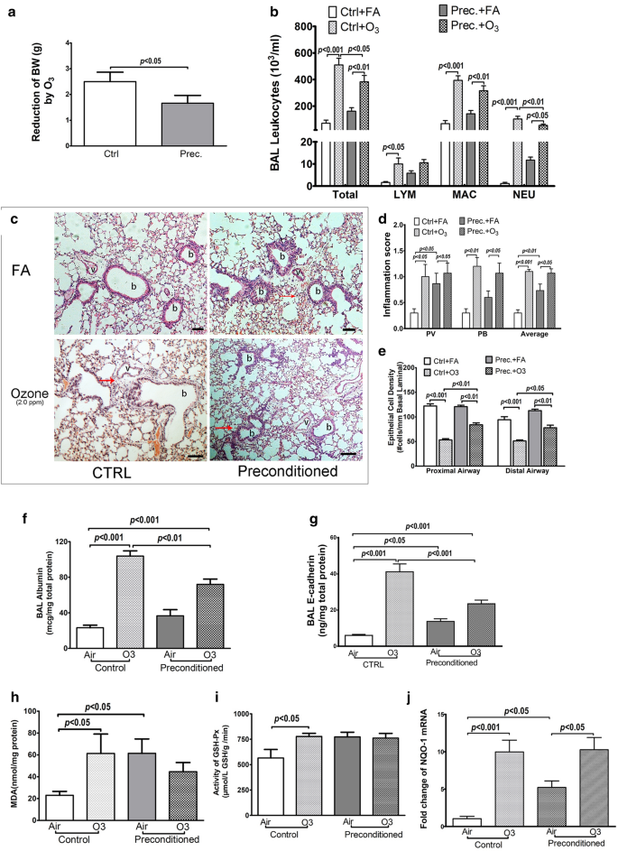 本环节核心目标是验证HSP20高表达对高浓度臭氧诱导的气道上皮损伤的保护作用。实验中对上述预处理模型小鼠,检测体重变化、支气管肺泡灌洗液(BALF)细胞计数、肺组织病理(H&E染色)、气道上皮细胞密度、BALF中白蛋白和E-钙粘蛋白浓度、肺组织丙二醛(MDA)含量和谷胱甘肽过氧化物酶(GSH-Px)活性、NQO-1 mRNA表达水平。
