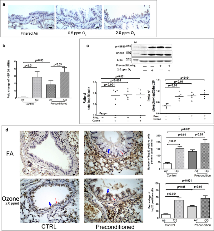 本环节核心目标是验证氧化应激可诱导小鼠气道上皮细胞表达HSP20,并构建HSP20稳定高表达的动物模型。实验中首先开展预实验,将6周龄雌性Balb/c小鼠(n=3)分别暴露于过滤空气、0.5ppm及2.0ppm臭氧1小时,24小时后取肺组织行免疫组化(IHC)检测HSP20表达;随后构建预处理模型,将小鼠(n=10)反复暴露于0.5ppm臭氧1小时/次,隔日一次共7天,对照组(n=10)暴露于过滤空气;48小时后,两组各5只小鼠进一步暴露于2.0ppm臭氧3小时,24小时后取肺组织,采用实时荧光定量PCR(RT-qPCR)检测HSP20 mRNA水平,蛋白质免疫印迹(Western blot)检测总HSP20及磷酸化HSP20蛋白表达,IHC检测气道上皮细胞HSP20的定位表达。