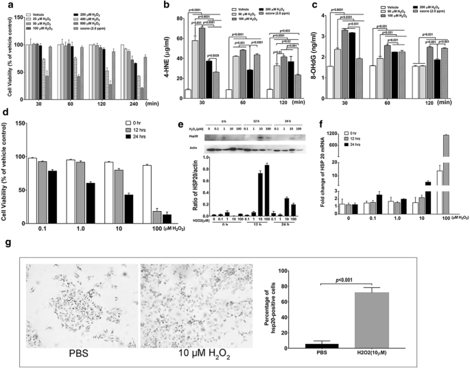 结果显示,MTS实验表明2.0ppm臭氧与50-200μM H2O2对细胞活力的影响相当(图4a);4-HNE和8-OHdG检测显示臭氧与H2O2诱导的氧化损伤水平相近(图4b、c);BEAS-2B细胞实验中,10μM H2O2刺激12小时后HSP20蛋白和mRNA表达水平最高(n=3,P<0.05,图4e、f),ICC染色显示HSP20表达显著增加(图4g),最终确定该条件为后续实验的最优参数。