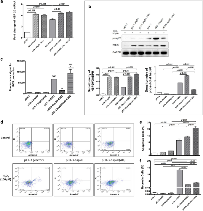 本环节核心目标是验证HSP20过表达及其磷酸化修饰对H2O2诱导的BEAS-2B细胞损伤的保护作用。实验中将BEAS-2B细胞分别转染pEX-3-HSP20(野生型)、pEX-3-HSP20(Ala)(非磷酸化突变体)、pEX-3(空载体)质粒,48小时后用10μM H2O2刺激1小时,12小时后检测HSP20 mRNA和蛋白表达、细胞内活性氧(ROS)水平、细胞凋亡情况(Annexin V-FITC/PI染色流式细胞术)。