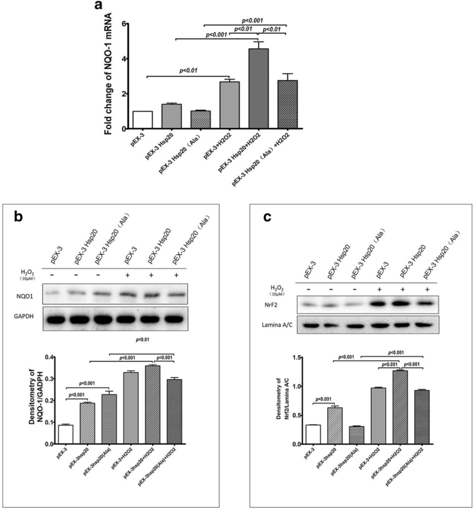 结果显示,H2O2刺激后,野生型转染组NQO-1 mRNA表达升高5倍,空载体和突变体组升高3倍(n=3,P<0.05,图6a);Western blot结果显示野生型转染组NQO-1蛋白水平显著高于突变体组(n=3,P<0.05,图6b);核内Nrf2蛋白水平在野生型转染组基础状态下即显著升高,H2O2刺激后升高更显著,而突变体组无明显变化(n=3,P<0.05,图6c)。上述结果表明HSP20磷酸化可促进Nrf2入核,上调NQO-1表达,进而激活细胞内抗氧化通路。