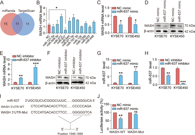 方法细节:首先利用TargetScan与miRanda数据库预测WASH 3"-UTR区域的miRNA结合位点,筛选得到11个候选miRNA;将各候选miRNA模拟物分别转染至KYSE70细胞,通过实时荧光定量PCR(qRT-PCR)筛选可显著抑制WASH表达的miRNA;随后在KYSE70与KYSE450两种ESCC细胞系中,分别转染miR-637模拟物或抑制剂,通过实时荧光定量PCR与蛋白质免疫印迹(Western blotting)检测WASH在mRNA与蛋白水平的表达变化;最后构建包含WASH 3"-UTR野生型与miR-637结合位点突变型的荧光素酶报告载体,与miR-637模拟物共转染293T细胞,检测荧光素酶活性以验证直接靶向关系。