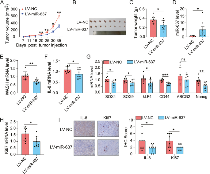 方法细节:通过慢病毒载体构建稳定过表达miR-637的KYSE450细胞系,将细胞皮下注射至NOD-scid IL2Rγ⁻/⁻(NTG)免疫缺陷小鼠体内(每组8只),每周两次测量肿瘤体积与小鼠体重;5周后处死小鼠,取出肿瘤组织,通过实时荧光定量PCR检测miR-637、WASH、IL-8、干细胞相关基因及Ki67的表达水平,通过免疫组化(IHC)检测肿瘤组织中IL-8与Ki67的蛋白表达水平。