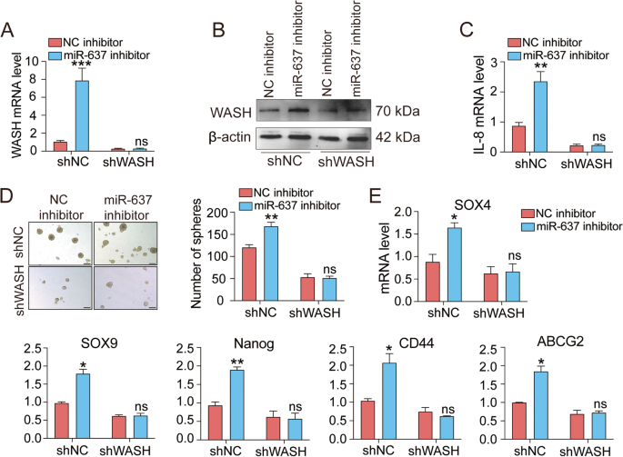 方法细节:通过慢病毒介导的短发夹RNA(shRNA)构建稳定敲低WASH的KYSE70细胞系(shWASH),并设置阴性对照(shNC);在shWASH与shNC细胞中转染miR-637抑制剂,通过实时荧光定量PCR与蛋白质免疫印迹检测WASH与IL-8的表达变化;通过肿瘤球形成实验检测肿瘤干细胞特性的变化,实时荧光定量PCR检测干细胞相关基因的表达水平。