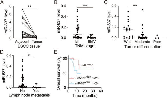 3.5 miR-637在ESCC临床样本中的表达及临床价值验证
